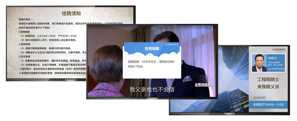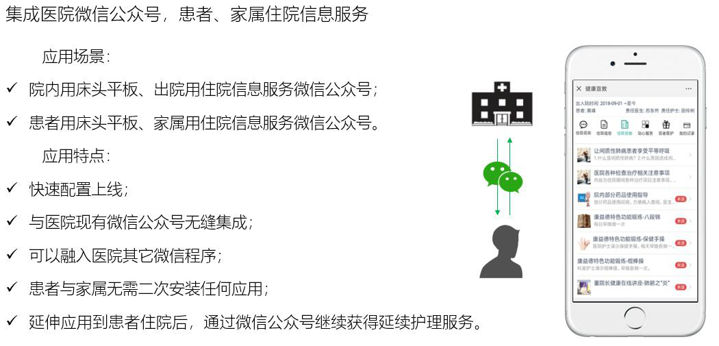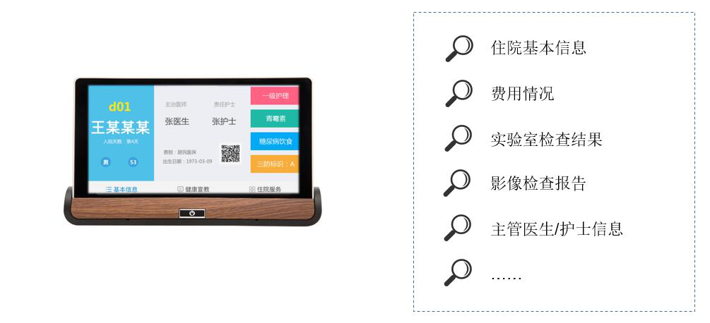 拓展床旁醫(yī)護(hù)、營養(yǎng)點餐、患者貼心服務(wù)、醫(yī)患交流、住院宣教、健康指導(dǎo)等功能,改善住院服務(wù)流程,改善患者就醫(yī)體驗,優(yōu)化醫(yī)患交互,改善醫(yī)療服務(wù)模式,提升智慧醫(yī)療的效率和水平。