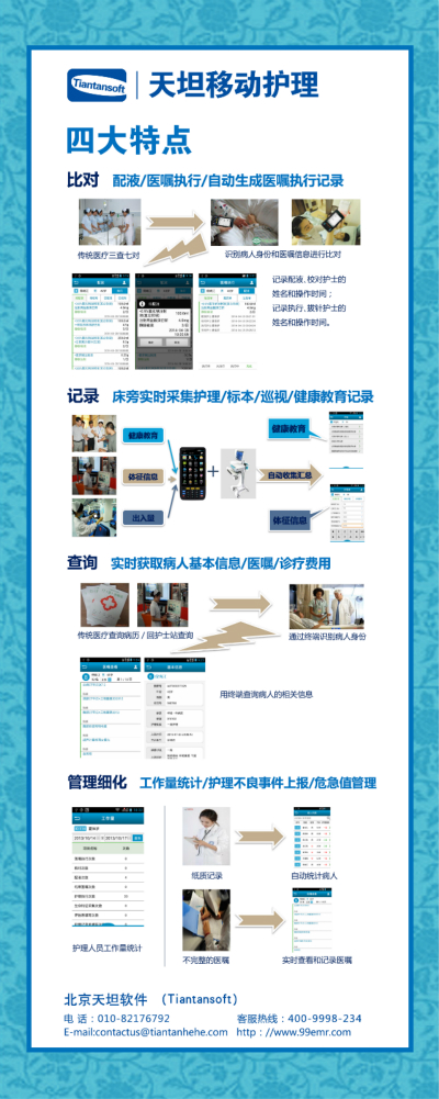 天坦移動(dòng)護(hù)理系統(tǒng)改變傳統(tǒng)護(hù)理工作模式。將審藥、配藥、治療等環(huán)節(jié)實(shí)現(xiàn)移動(dòng)化、條碼化、共享化。確保信息準(zhǔn)確,用藥安全;系統(tǒng)將護(hù)理工作變得更方便、更自由,護(hù)士可以在任何地點(diǎn)調(diào)取病歷、化驗(yàn)報(bào)告、檢查影像,利用各種移動(dòng)終端完成醫(yī)囑執(zhí)行、床前護(hù)理文書錄入等護(hù)理操作,極大地減少護(hù)理管理人員的工作量,提高整個(gè)護(hù)理工作的工作效率與醫(yī)療質(zhì)量。